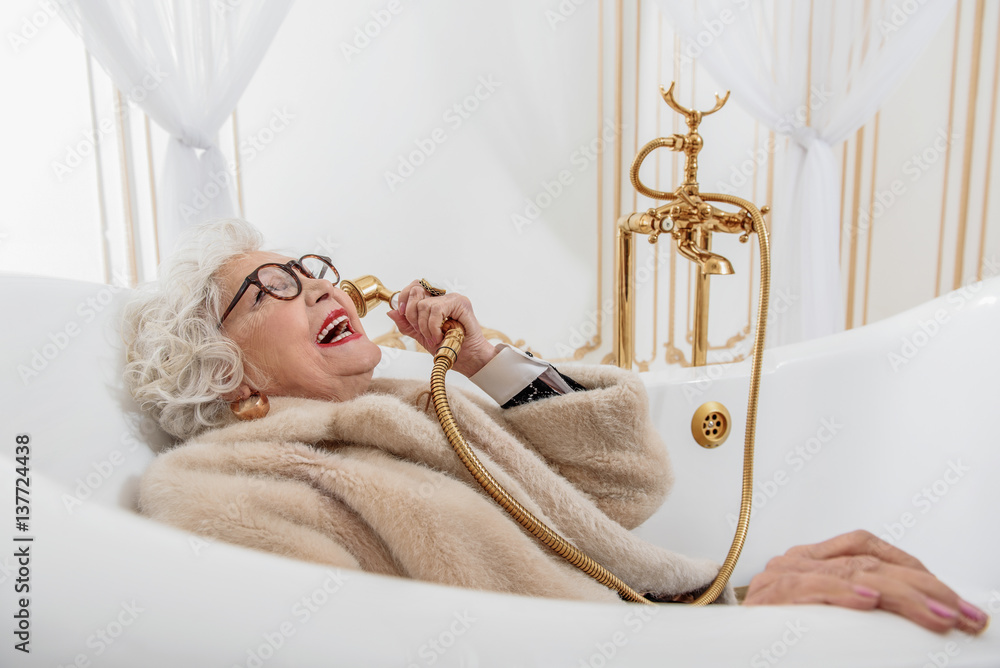 Lustige ältere Dame Mit Pelzmantel In Der Badewanne Foto